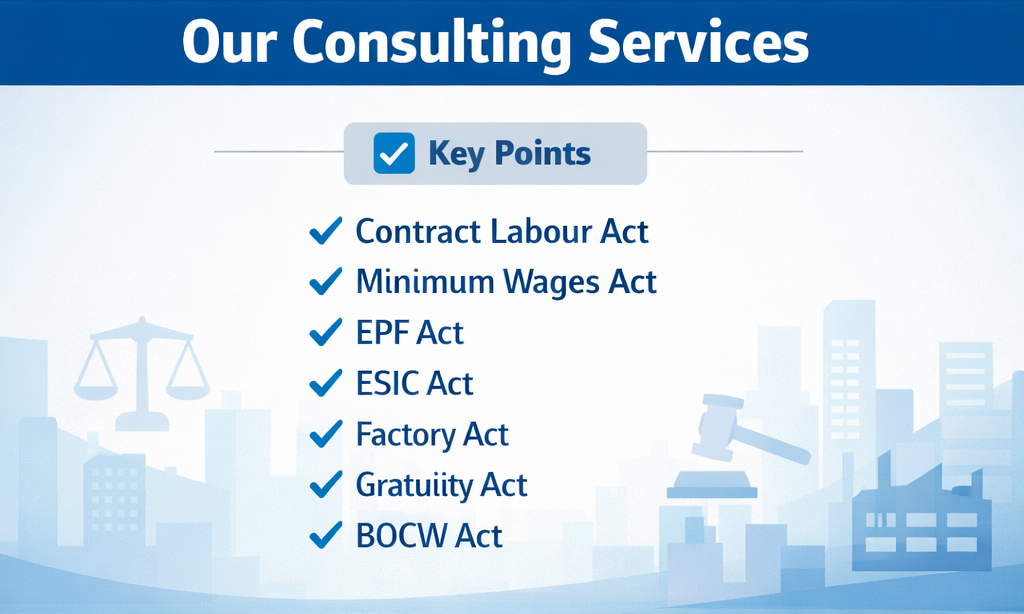 Our expertise spans Labour Law Consultancy, EPF & ESIC Compliance, Payroll Processing, Factory Act Compliance, Contract Labour Management, and ongoing statutory support tailored to your business needs.